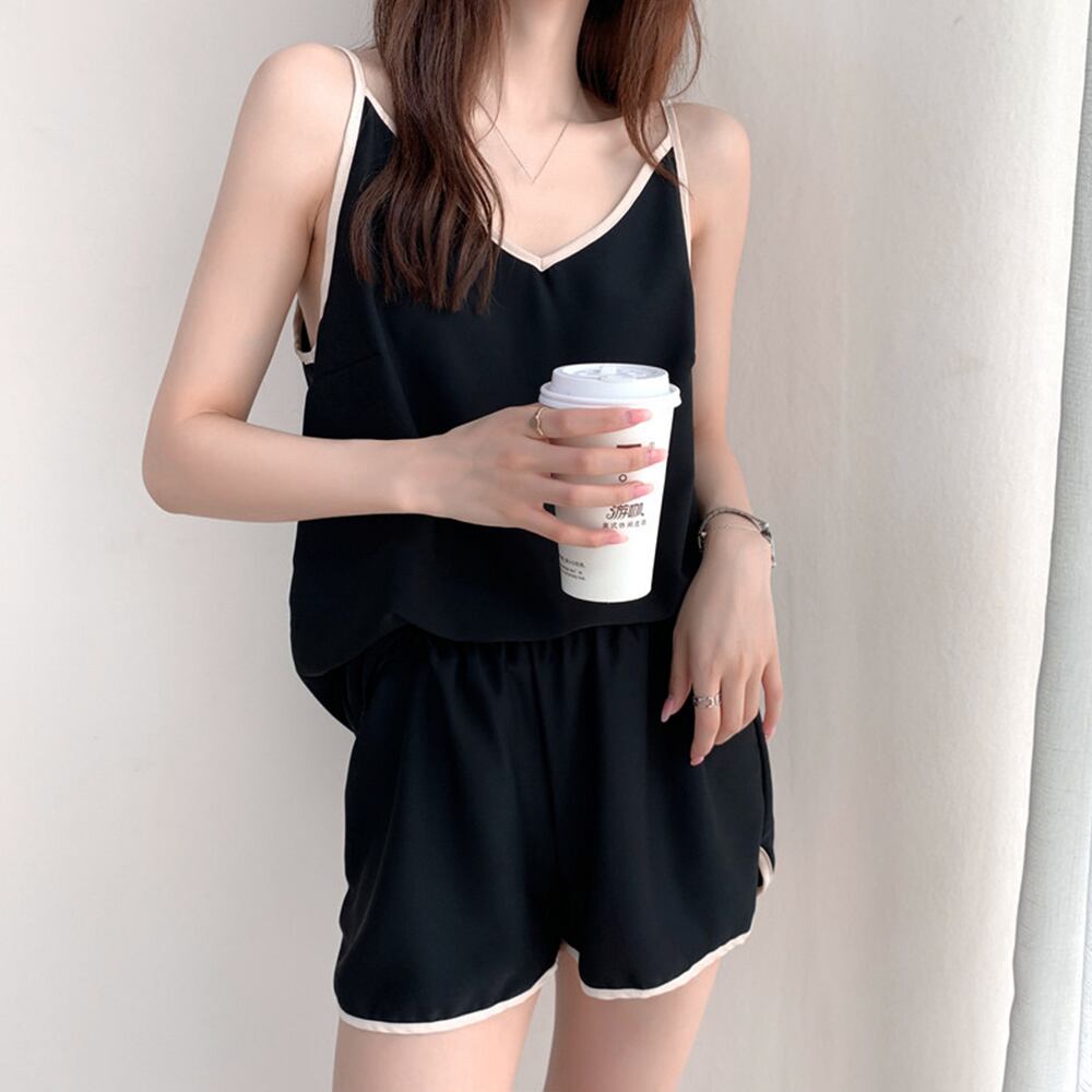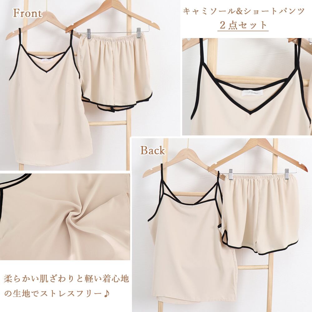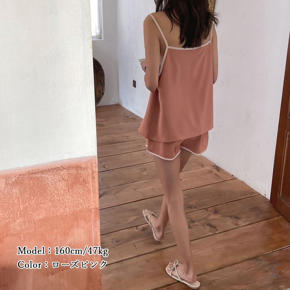 大人可愛い Vネック キャミソール ショートパンツ 上下セット 薄手 セクシー パジャマ2点セット バイカラー 韓国風パイピング 寝巻き 夏トップス セット リラックスウェア春キャミソール+ショートパンツのルームウエアセットアップが新登場柔らかい肌ざわりと軽い着心地の生地でストレスフリーセットアップはもちろんシングルユースでも使い勝手抜群、毎日着用したくなるアイテムトップス素材:ポリエステル100%ボトムス素材:ポリエステル100%カラー:ブラック/アイボリー/ローズピンク/ダークグレーサイズ:ワンサイズトップス:着丈:約58cm 身幅:約47cm 胸囲:約94cmボトムス:着丈:約30.5cm 股下:約7.5cm ウエスト(ゴム仕様):約56-100cm ヒップ:約106cm もも周り:約66cm裏地:なし伸縮性:なし透け感:アイボリーのみややあり生産国:中国※すべて平置きサイズです(採寸方法違いより、多少の誤差がございますので、ご了承ください)。※海外輸入品のため、商品の細部仕様は多少異なる場合がございます。予めご了承の上、ご注文お願い致します。