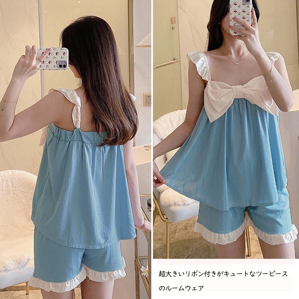 夏 パジャマセット 大きいリボンキャミソール ショートパンツ 大人可愛い ツーピース 寝間着 ルームウエア ナイトウエア上下 2点セット フリルリボン部屋着 無地 寝巻き 春夏超大きいリボン付きがキュートなツーピースのルームウェア薄手な素材を採用し、通気性がよく涼しく快適な着心地おうちでのリラックスタイムで便利なパジャマや、部屋着、ルームウエアなど大活躍素材:ポリエステル100%カラー:ホワイト/ミントグリーン/ブルー/ピンク/ラベンダー/イエローサイズ:ワンサイズ(XL)トップス:着丈:約62cm 身幅:約66cm 胸囲(ゴム仕様):約66-100cmボトムス:着丈:約37cm 股下:約12cm ウエスト(ゴム仕様):約50-92cm ヒップ:約114-126cm もも周り:約62-74cm裏地:なし伸縮性:あり透け感:ホワイトのみ若干あり生産国:中国※すべて平置きサイズです(採寸方法違いより、多少の誤差がございますので、ご了承ください)。※海外輸入品のため、商品の細部仕様は多少異なる場合がございます。予めご了承の上、ご注文お願い致します。