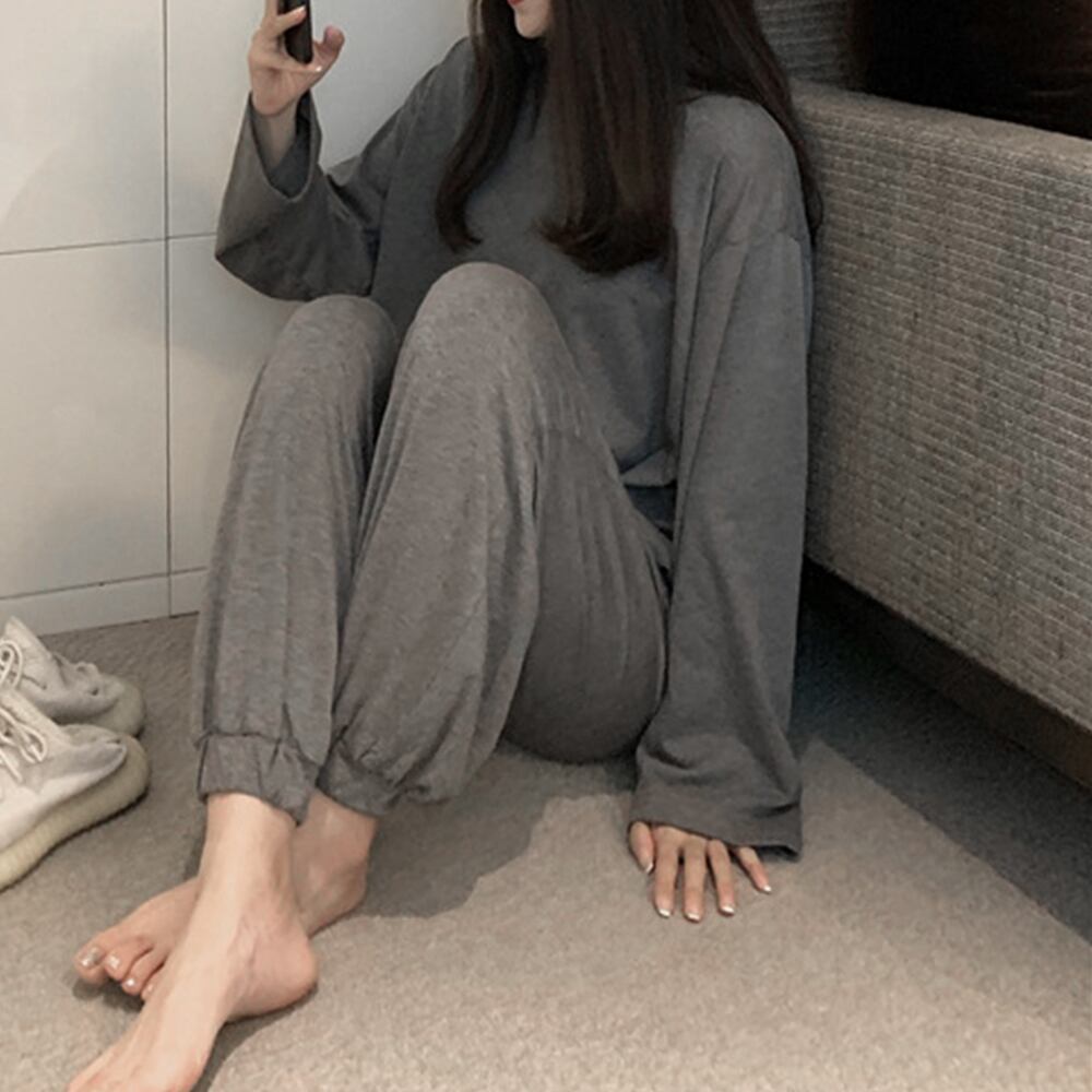 ほどよい伸縮性があるので着心地の良いルームウェア2点セット肌触りの良い柔らかな風合いが特徴半袖を着るにはちょっと肌寒いなという時にオススメ素材:綿30%+ポリエステル70%カラー:ダークグレーサイズ:ワンサイズ(L)トップス:着丈:約65cm 肩幅:約50cm 袖丈:約51cm ゆき:約76cm 身幅:約56cm 胸囲:約112-130cmボトムス:着丈:約93cm 股下:約62cm ウエスト(ゴム仕様):約60-94cm ヒップ:約98-130cm もも周り:約58cm裏地:なし伸縮性:あり透け感:なし生産国:中国※すべて平置きサイズです(採寸方法違いより、多少の誤差がございますので、ご了承ください)。※海外輸入品のため、商品の細部仕様は予告なく変更になる場合がございます。予めご了承の上、ご注文お願い致します。
