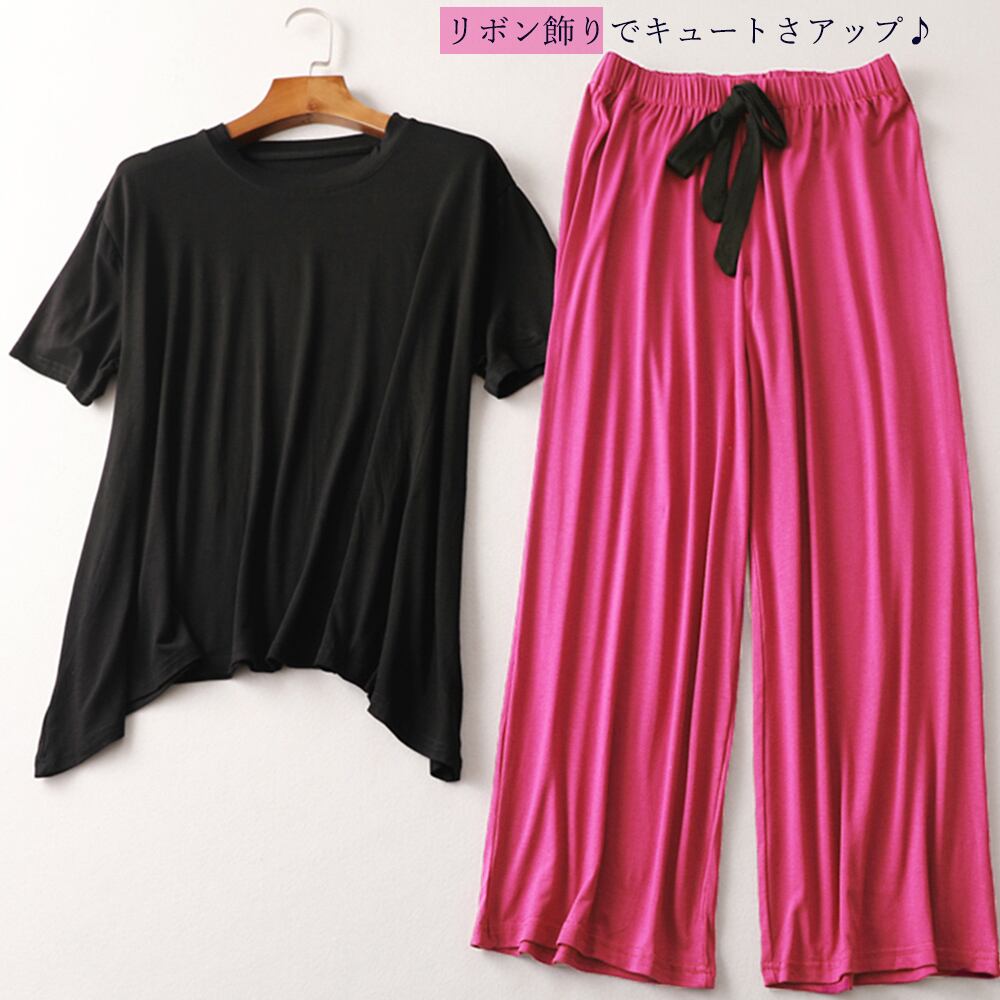 ルームウェア 上下セット レディース パジャマ 2点セット 半袖 部屋着セット ゆったり セットアップ 春夏ロングパンツセット 寝巻き セット トップス セットロングパンツと半袖トップスのルームウェア2点セットですゆったりとしたシルエットで動きやすくラフな着心地を実現し、家にいる時間を快適に過ごせますルームウェアとしてもヨガやスポーツなどでも使っていただけます素材:レーヨン95%+ポリウレタン5%カラー:ブラック*ホットピンク/ホワイト*パープル/イエロー*ダークグレー/グレー*ブルー/ベージュ*モカ/ピンク*グレーサイズ:ワンサイズトップス:着丈:最長約59cm/最短約54cm 肩幅:約43cm 袖丈:約17cm ゆき:約38.5cm 身幅:約52cm 胸囲:約104-134cmボトムス:着丈約84cm 股下:約57cm ウエスト:約60-84cm(ゴム仕様) ヒップ:約100-130cm もも周り:約60-90cm裏地:なし伸縮性:あり透け感:なし生産国:中国※すべて平置きサイズです(採寸方法違いより、多少の誤差がございますので、ご了承ください)。※海外輸入品のため、商品の細部仕様は多少異なる場合がございます。予めご了承の上、ご注文お願い致します。