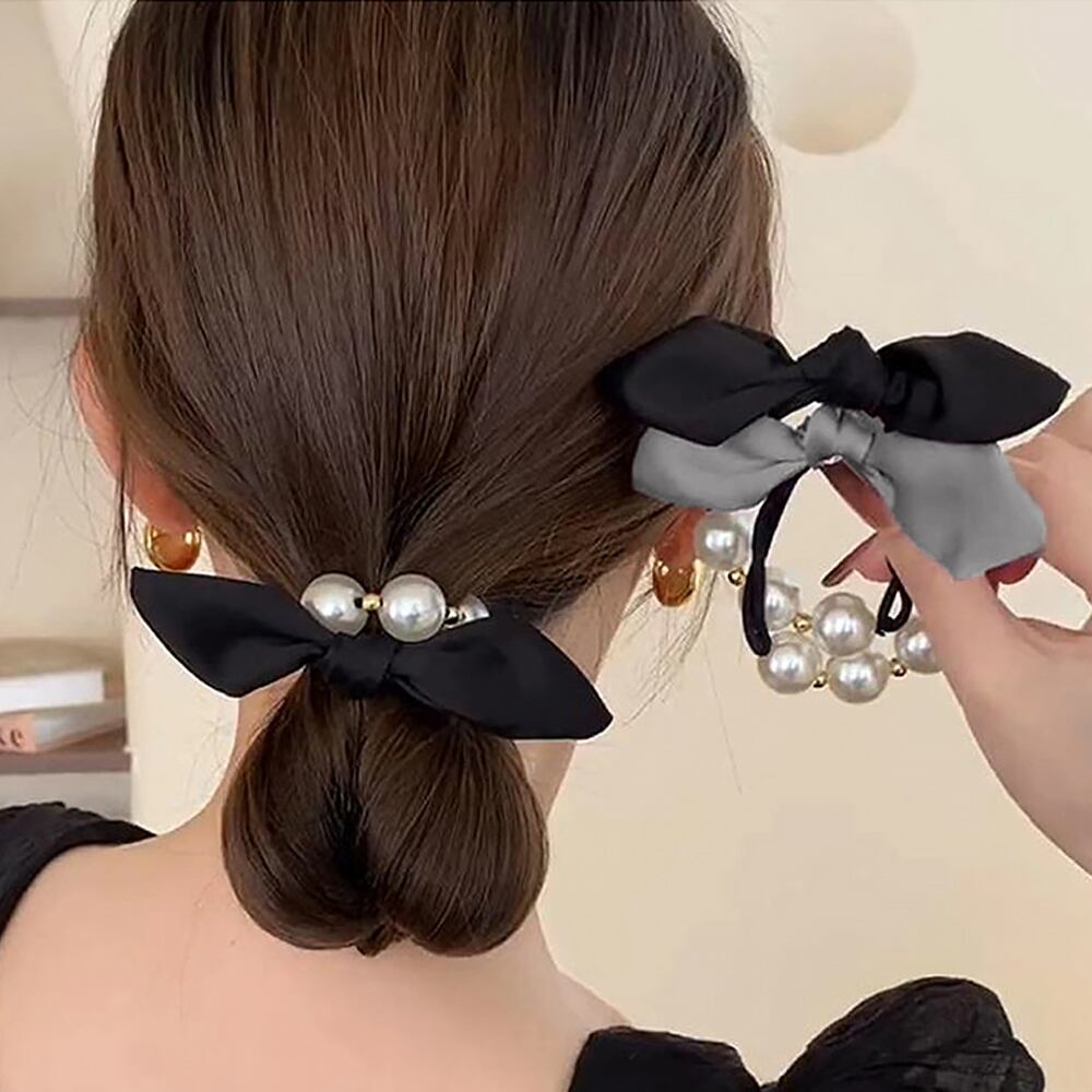 フェイクパールとリボンがアクセントになるヘアゴム。