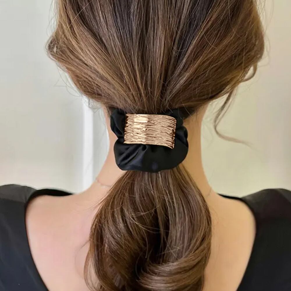 シンプルながらもきちんと感や上品な雰囲気を演出するゴールドプレート付きヘアゴム
