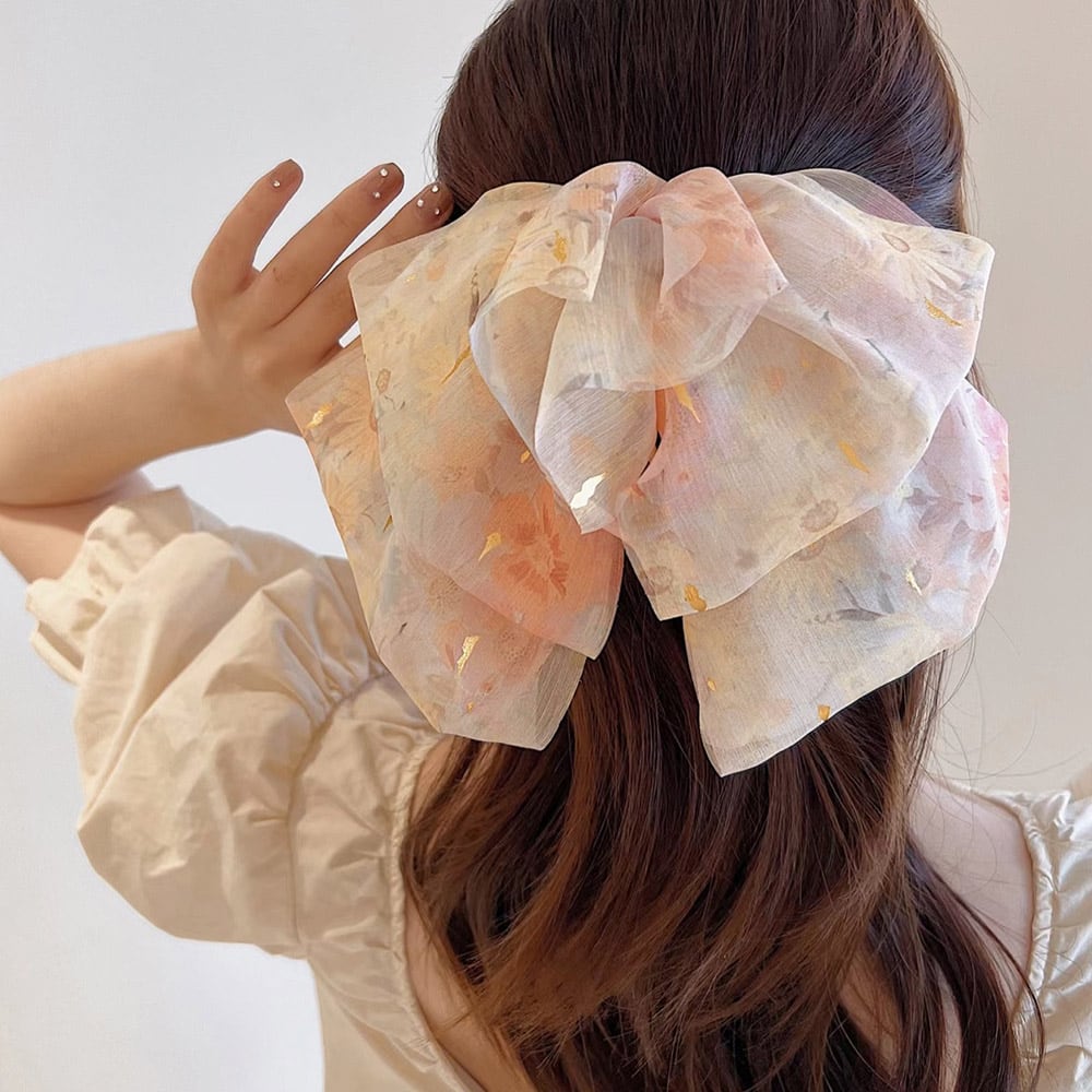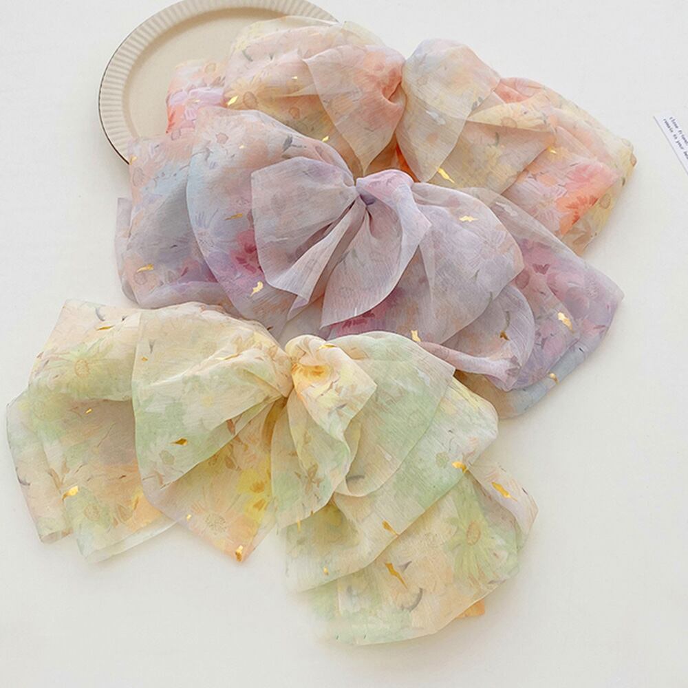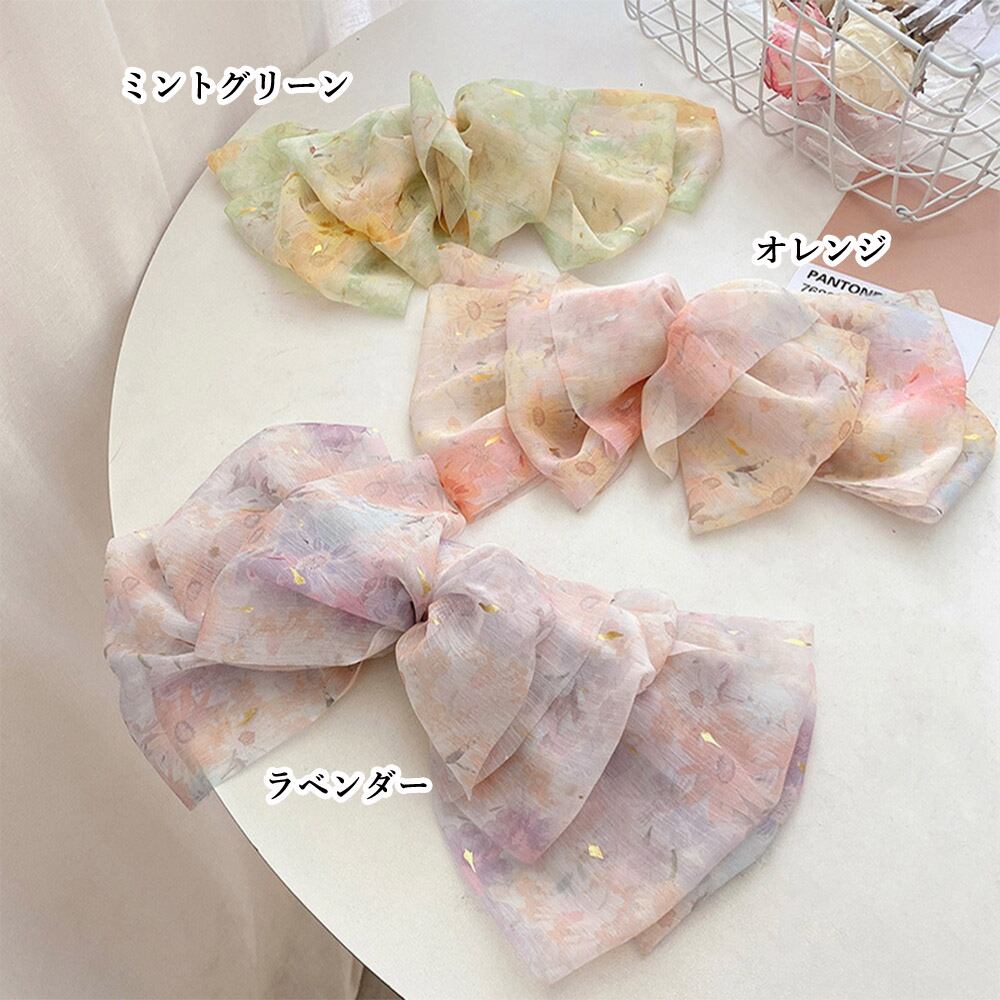 花柄 シフォンバレッタ 大きめリボン 髪飾り 蝶々結び 大人可愛い まとめ髪カジュアル女子会 おしゃれ 流行りタイダイ柄