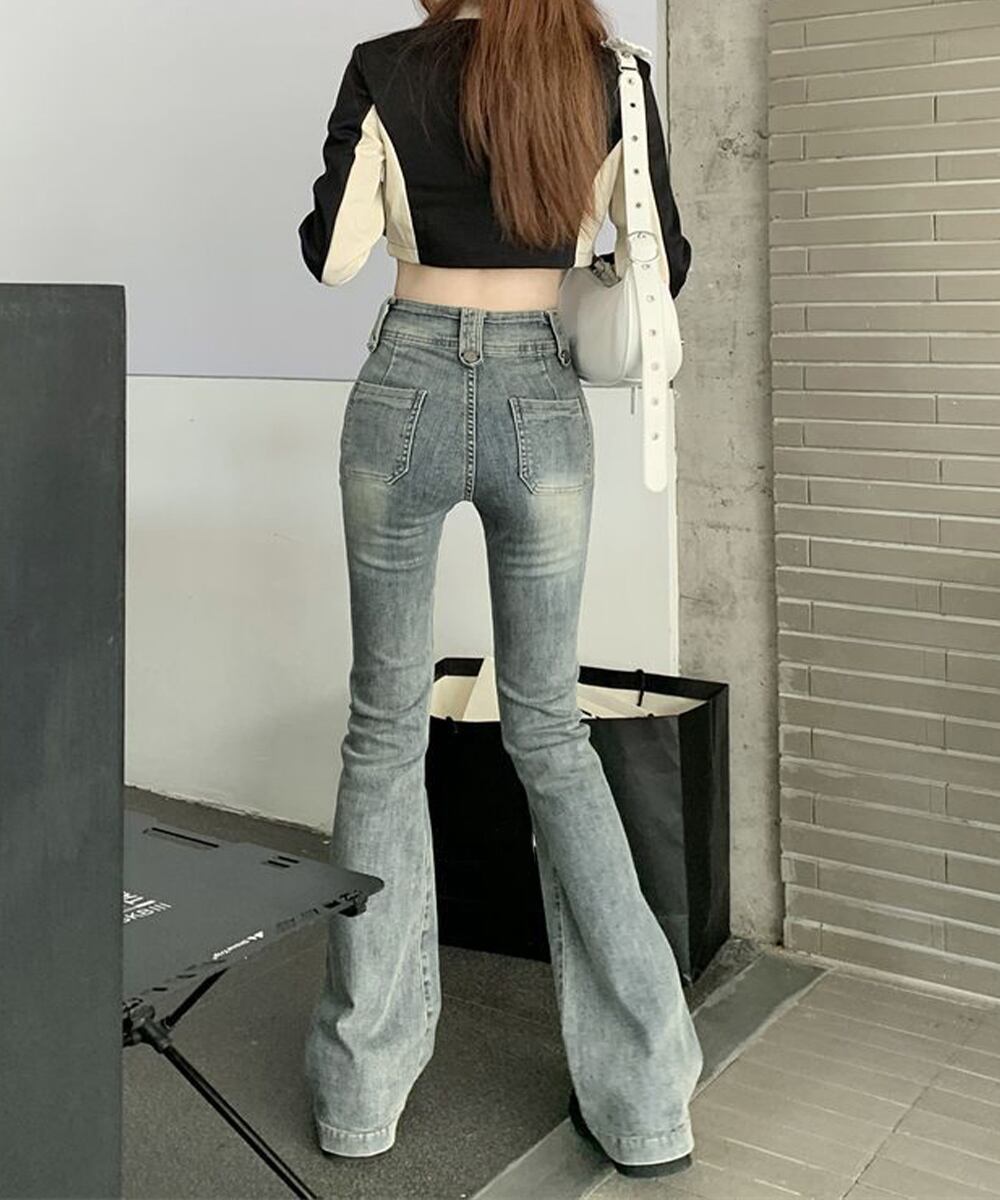 ウォッシュ加工が施され、独特の色合いと風合いが魅力のフレアデニムパンツ。