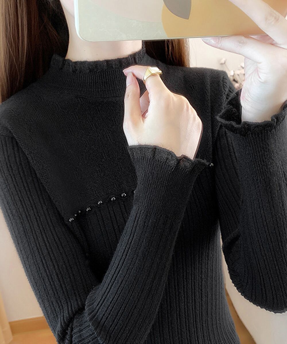 ニットセーターレディース メロウフリルニット パール付きベーシックニットインナー着回し重ね着 レース切替 チクチクしない